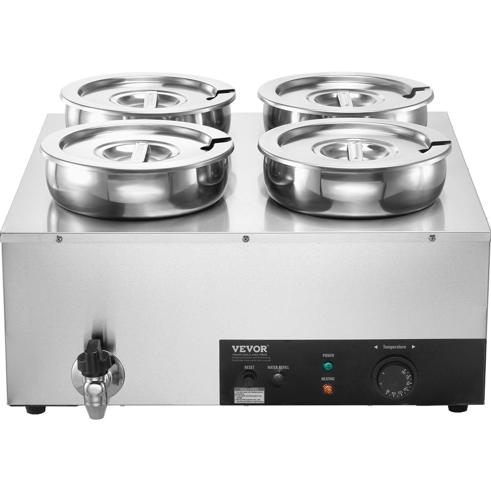 Includes Four 7.4Qt Soup Pots: Our commercial soup warmer comes equipped with Four 7.4Qt round pots with their respective lids, allowing you to serve different dishes simultaneously. Feel free to change up your menu from soups and sauces to stew, or even nacho cheese and chocolate.